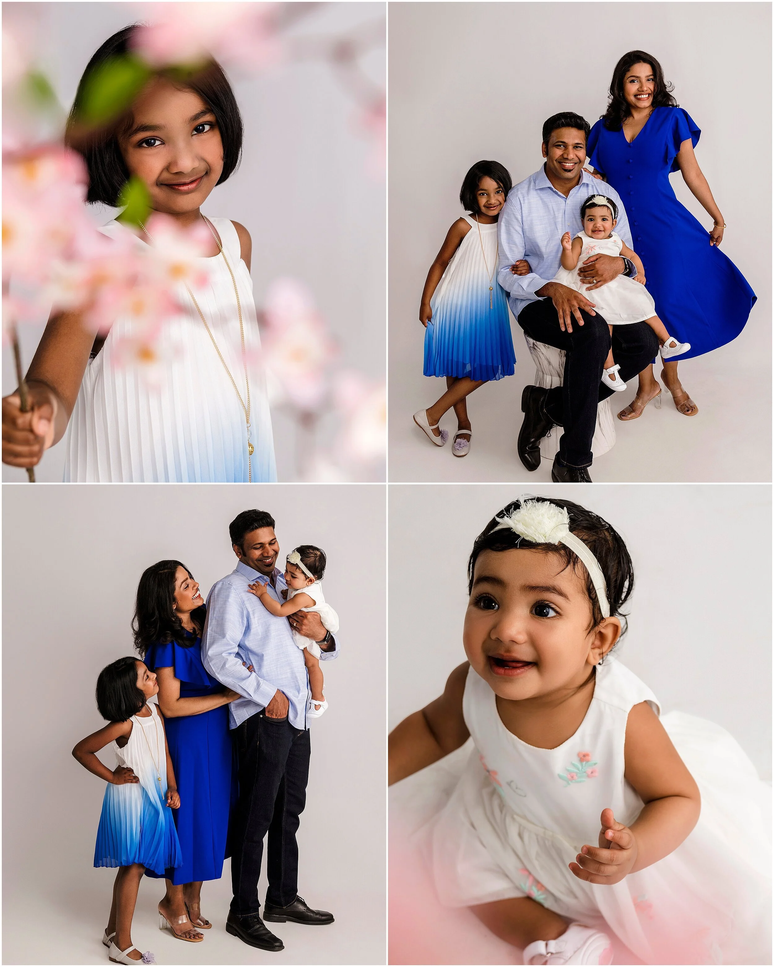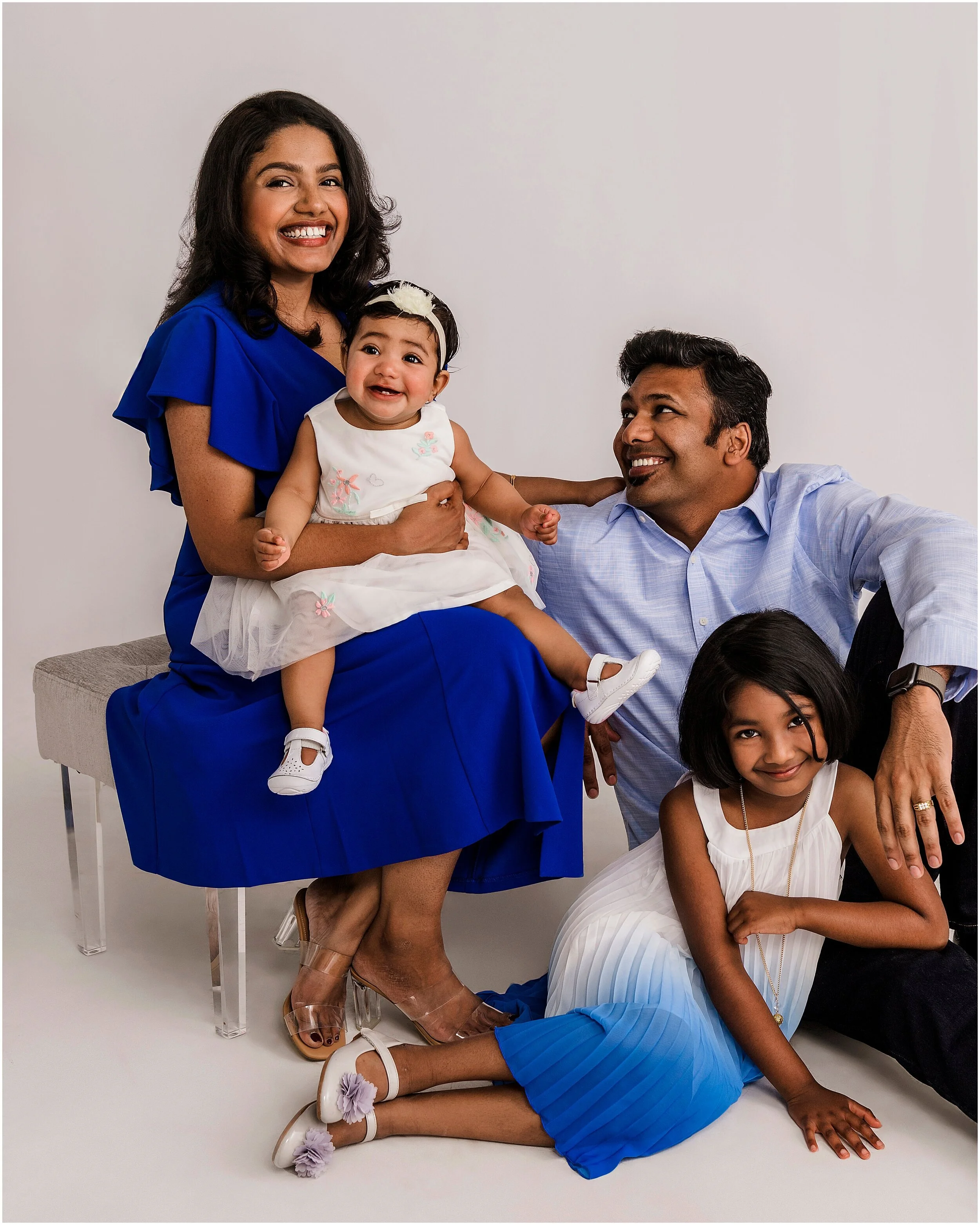 The Chandran family were inspired by bright, modern portraits with pops of color and full of emotion. Playing with their two adorable girls in the studio resulted in fabulous smiles all around!