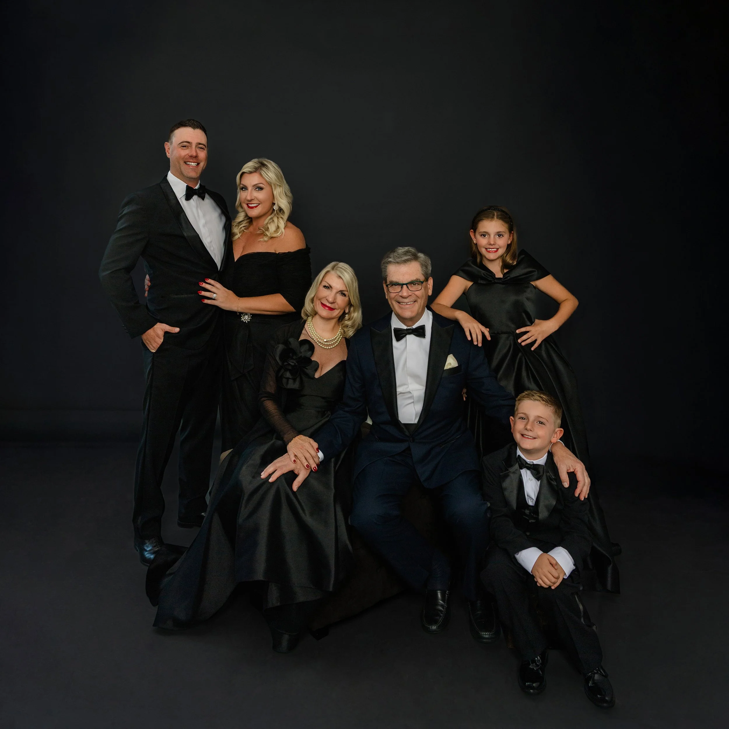 Black tie elegance meets family portraits in this multigenerational photoshoot with the Dewalts, joined by their children and grandchildren. Everyone was dressed to the nines with the ladies in beautiful ballgowns and the gentlemen in bow ties. Keeping everyone in a chic black across the board allowed for everyone to be cohesive.