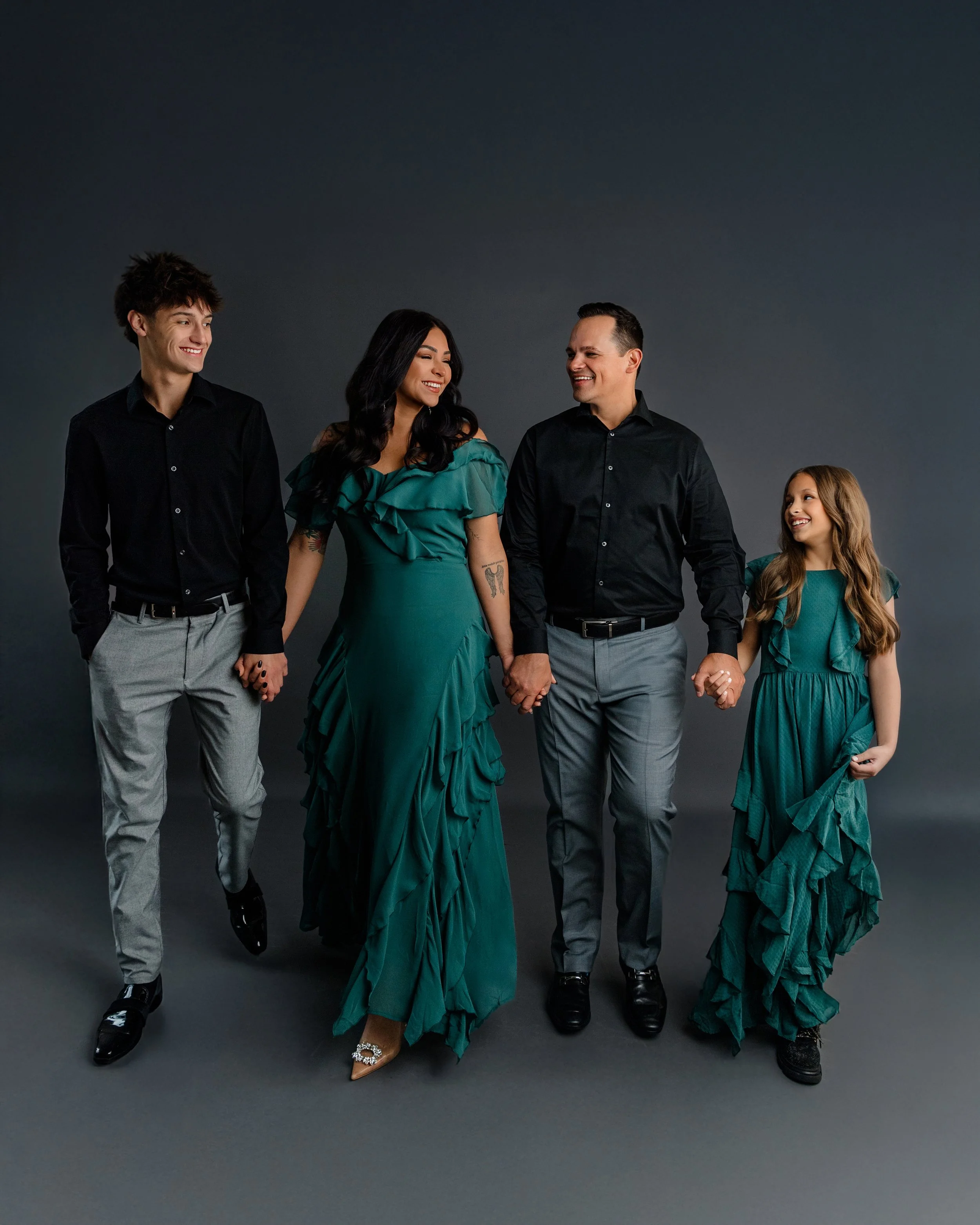 The Vestmans wanted to create something high fashion, formal, and dramatic for their family portrait experience. The ladies wore gorgeous emerald green gowns that allowed for movement and fun, and the fellas were outfitted in classic gray + black combinations to anchor the look.